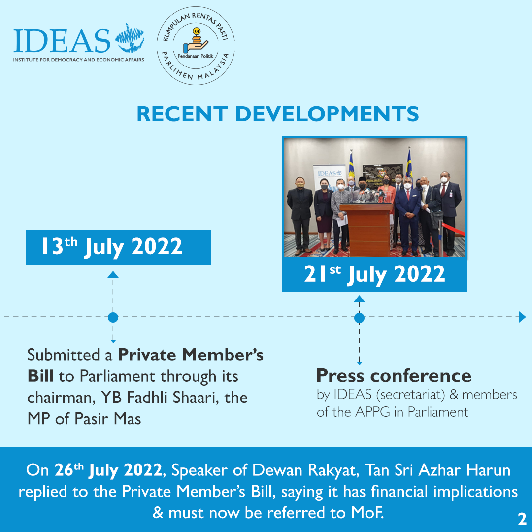 This week, we feature the chronology of the APPGM on Political Financing, from its approval by the Secretary of the Dewan Rakyat on 20 April 2022 to recent developments in aiming for a Political Financing Act (PFA) to be passed into law.