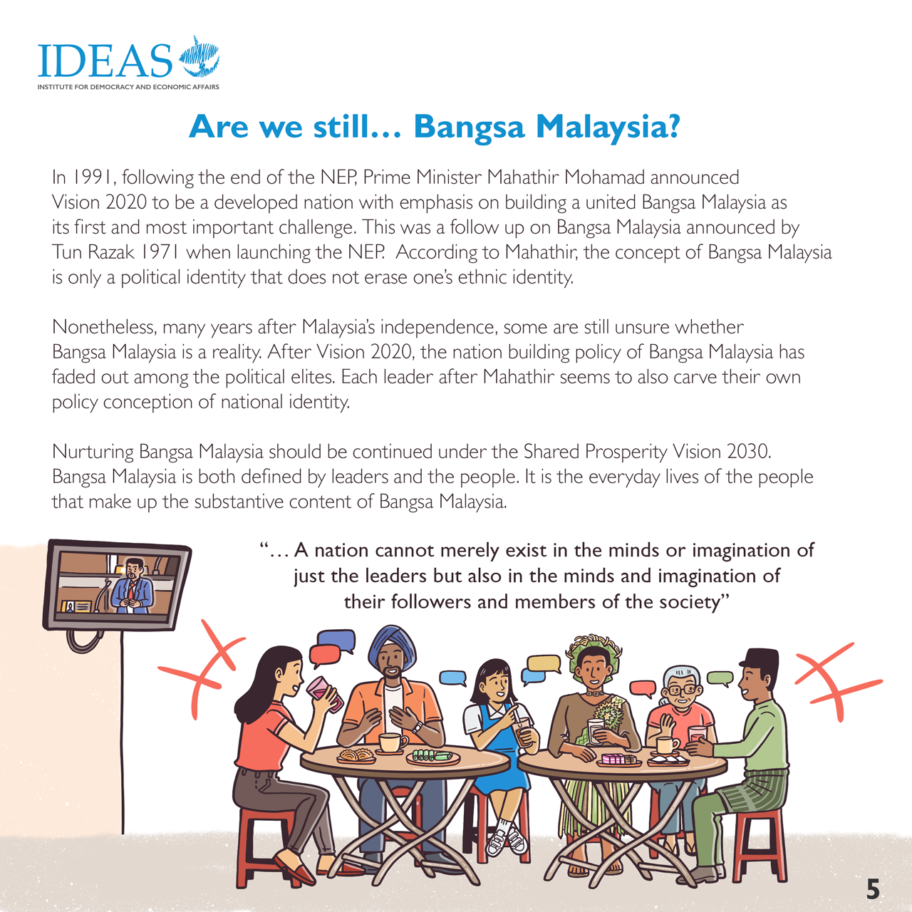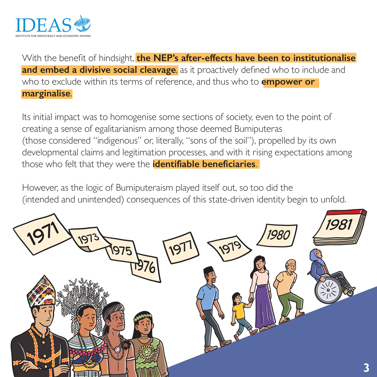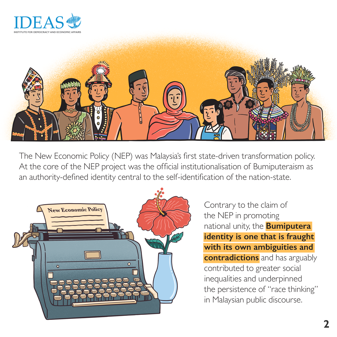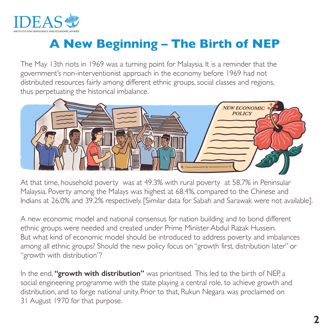 In 2021, the New Economic Policy (NEP) commemorates its 50th birthday. This is an opportune moment to revisit the NEP, especially its philosophical underpinnings, its achievements, impact, challenges and unintended consequences, and the lessons that can be drawn for future development and nation building efforts. The NEP is a strategic plan for nation building with the overriding objective to achieve national unity. However, it is pertinent to note that even after 50 years of the NEP, a National Unity Plan had to be crafted and introduced in early 2021. This implies that issues of inter-ethnic/race relations, unity, social cohesion, national identity and nation building are still very much with us. These issues cannot be taken for granted, and must be addressed seriously in academic and policy discourses, and embedded in policy making and implemented.