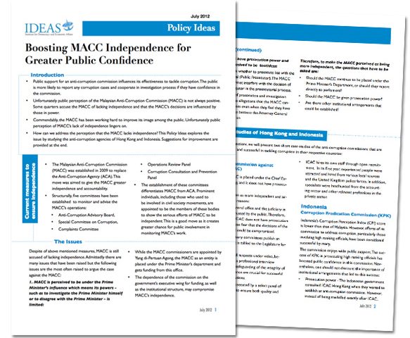 This Policy Ideas explores negative public perception of MACC’s independence and recommends several steps that can be taken to improve this perception. By learning from the experience of anti-corruption agencies of Hong Kong and Indonesia, IDEAS recommends that: