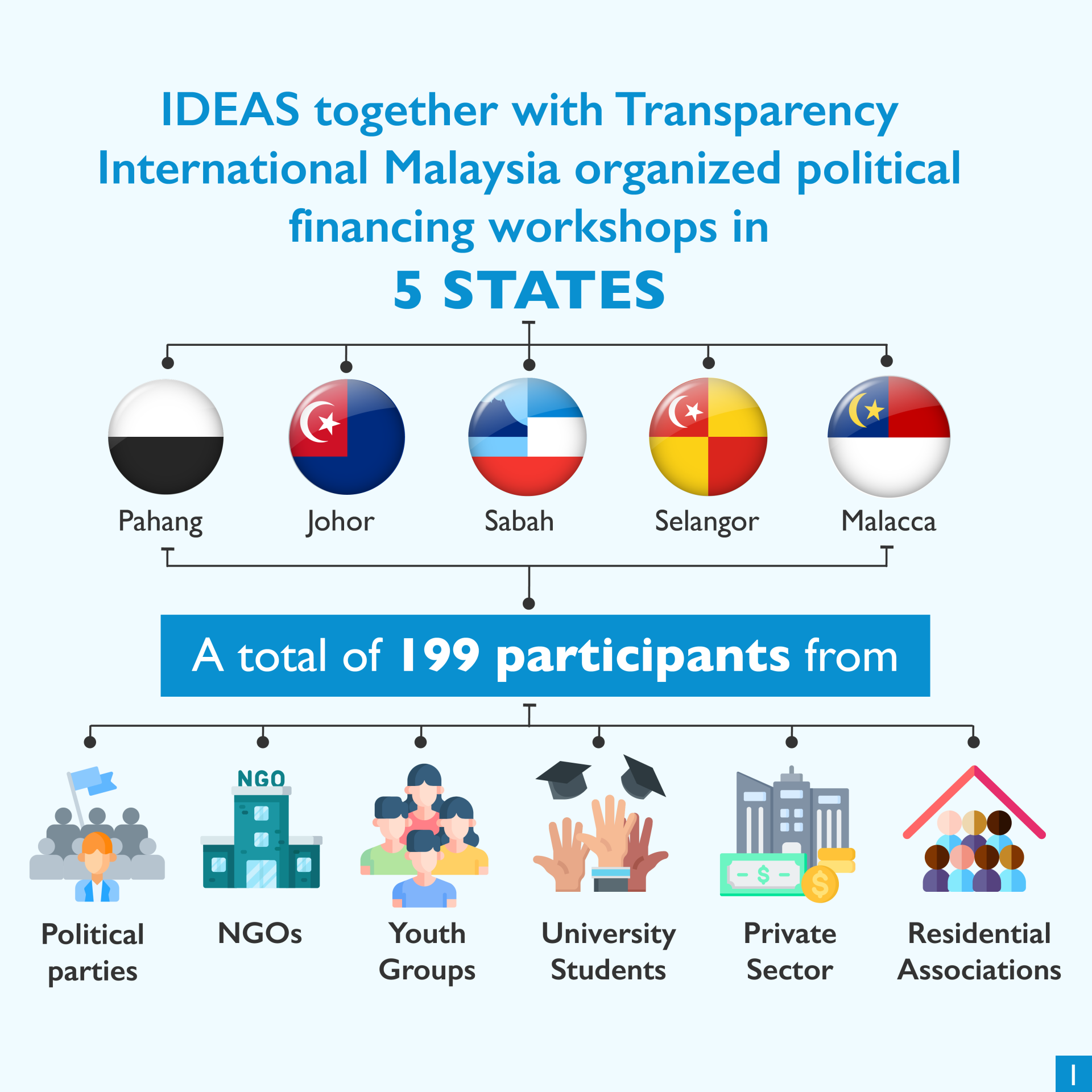 𝗜𝗻 𝟮𝟬𝟮𝟯, 𝘄𝗲 𝗵𝗲𝗹𝗱 𝗮 𝘁𝗼𝘁𝗮𝗹 𝗼𝗳 𝗳𝗶𝘃𝗲 𝗣𝗼𝗹𝗶𝘁𝗶𝗰𝗮𝗹 𝗙𝗶𝗻𝗮𝗻𝗰𝗶𝗻𝗴 𝗪𝗼𝗿𝗸𝘀𝗵𝗼𝗽𝘀 𝗻𝗮𝘁𝗶𝗼𝗻𝘄𝗶𝗱𝗲, 𝘀𝗽𝗮𝗻𝗻𝗶𝗻𝗴 𝟱 𝘀𝘁𝗮𝘁𝗲𝘀 𝗼𝘃𝗲𝗿𝗮𝗹𝗹 𝗮𝗻𝗱 𝗿𝗲𝗰𝗲𝗶𝘃𝗲𝗱 𝗮𝘀 𝗺𝗮𝗻𝘆 𝗮𝘀 𝟭𝟵𝟵 𝗽𝗮𝗿𝘁𝗶𝗰𝗶𝗽𝗮𝗻𝘁𝘀 𝘁𝗼 𝗮𝗱𝘃𝗼𝗰𝗮𝘁𝗲 𝗼𝗻 𝘁𝗵𝗲 𝗶𝗻𝘁𝗿𝗼𝗱𝘂𝗰𝘁𝗶𝗼𝗻 𝗼𝗳 𝘁𝗵𝗲 𝗣𝗼𝗹𝗶𝘁𝗶𝗰𝗮𝗹 𝗙𝗶𝗻𝗮𝗻𝗰𝗶𝗻𝗴 𝗔𝗰𝘁, 𝗮𝗻 𝗲𝗳𝗳𝗼𝗿𝘁 𝗰𝗮𝗿𝗿𝗶𝗲𝗱 𝗼𝘂𝘁 𝗯𝘆 𝗜𝗗𝗘𝗔𝗦 𝗮𝗻𝗱 𝗮 𝗿𝗮𝗻𝗴𝗲 𝗼𝗳 𝗼𝘁𝗵𝗲𝗿 𝗖𝗦𝗢𝘀 𝗮𝗰𝗿𝗼𝘀𝘀 𝗠𝗮𝗹𝗮𝘆𝘀𝗶𝗮.